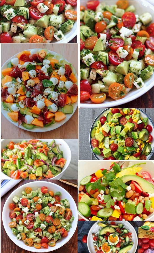 Ingredience (pro 2 osoby): 12 cherry rajčat 1 okurka 1 lžíce olivového oleje (30 g) 1 lžíce červeného vinného octa (30 g) pepř dle přání 10 kostek feta 1 hrst nasekané petrželky 1 avokádo 1/2 nakrájené červené cibule příprava: