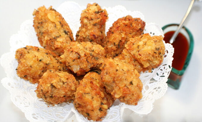 Suroviny Budeme potřebovat: 2 ks kuřecí prsa 1 bal. bramborové lupínky 50 g strouhanka 1 lžička mleté papriky pikantní 2 lžičky sušená petrželka 1 lžička sušený česnek 1 lžička vegeta 1 lžička koření dle chuti 2 ks vejce 100 g hladká mouka olej na smažení Postup receptu
