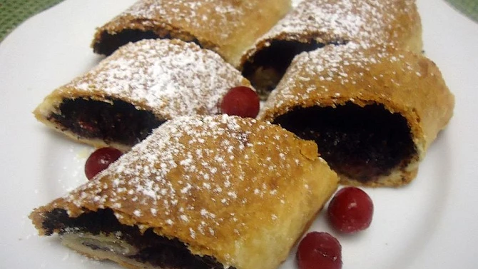 Náplň vaječné bílky 2 cukr krupice 200 g voda 46 g moučkový cukr (na posypání) Těsto hladká mouka 310 g máslo 250 g vejce 1 ocet 1 ML sůl 1/2 ML voda Postup
