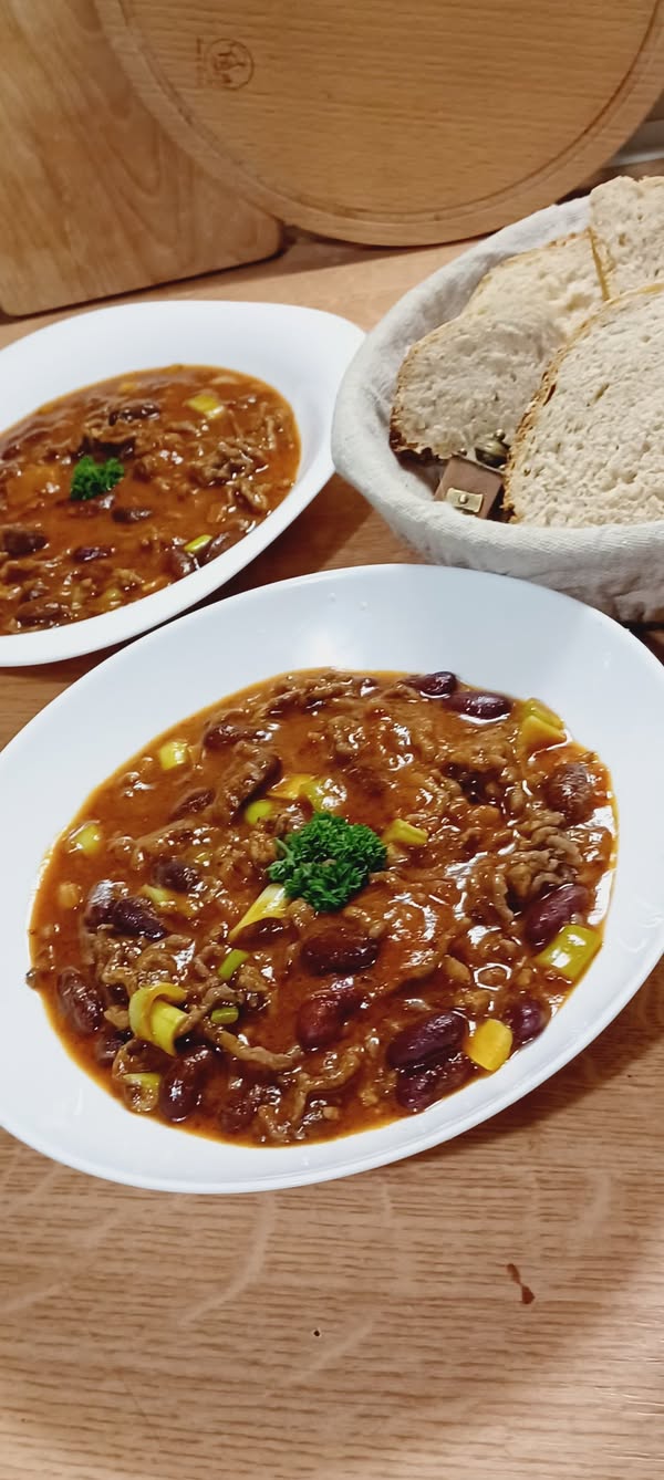 Suroviny: 500 g hovězího mletého masa 1 střední cibule (nasekaná) 400 g sekaných rajčat (konzervovaných nebo čerstvých) 2-3 stroužky česneku (nasekaného) 1 lžička sušené majoránky 400 g červených fazolí (předem uvařených) 2-3 jarní cibulky (nasekané) Vývar nebo voda (na podlití) Sůl a pepř podle chuti Ovesné vločky (na zahuštění, volitelné) Postup: