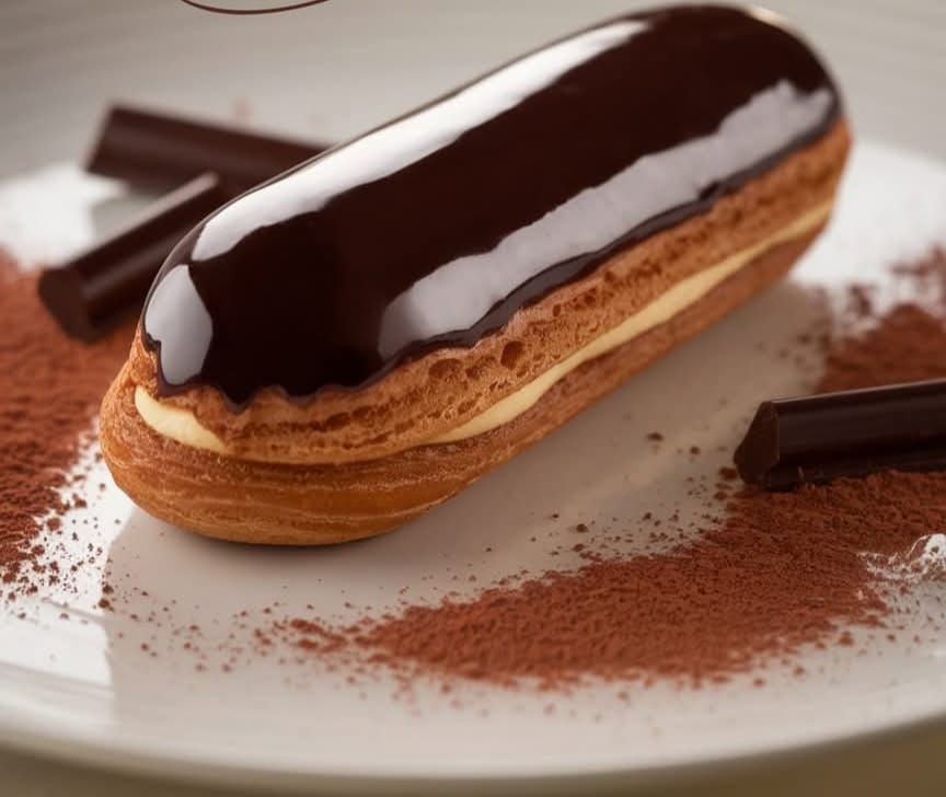 Čokoládový éclair je klasický francouzský dezert, známý pro své lehké odpalované těsto a krémovou čokoládovou náplň. Je to dezert oblíbený pro svou vzdušnou texturu a bohatou chuť.