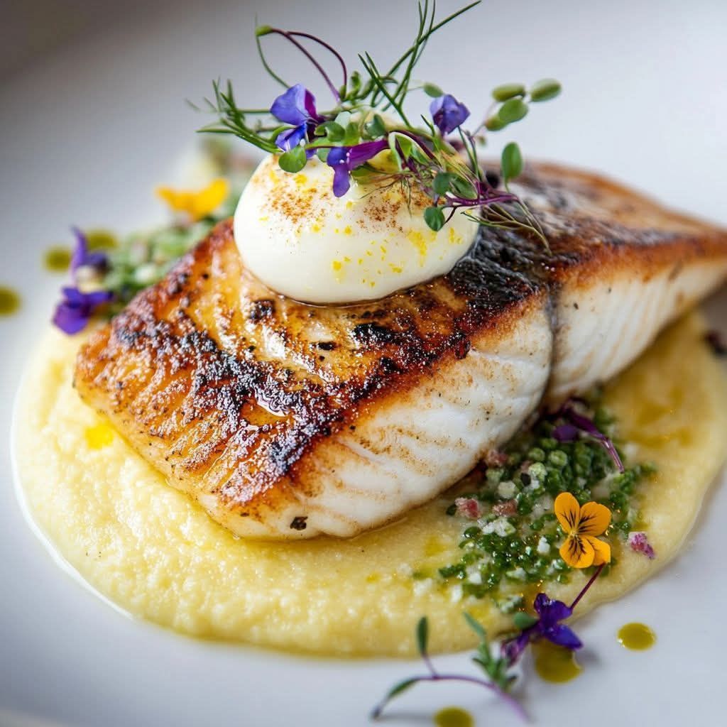 Dokonale grilovaný mořský vlk s krémovou parmazánovou česnekovou polentou, citronovou česnekovou pěnou a ozdobou z mikrobylin a jedlých květin