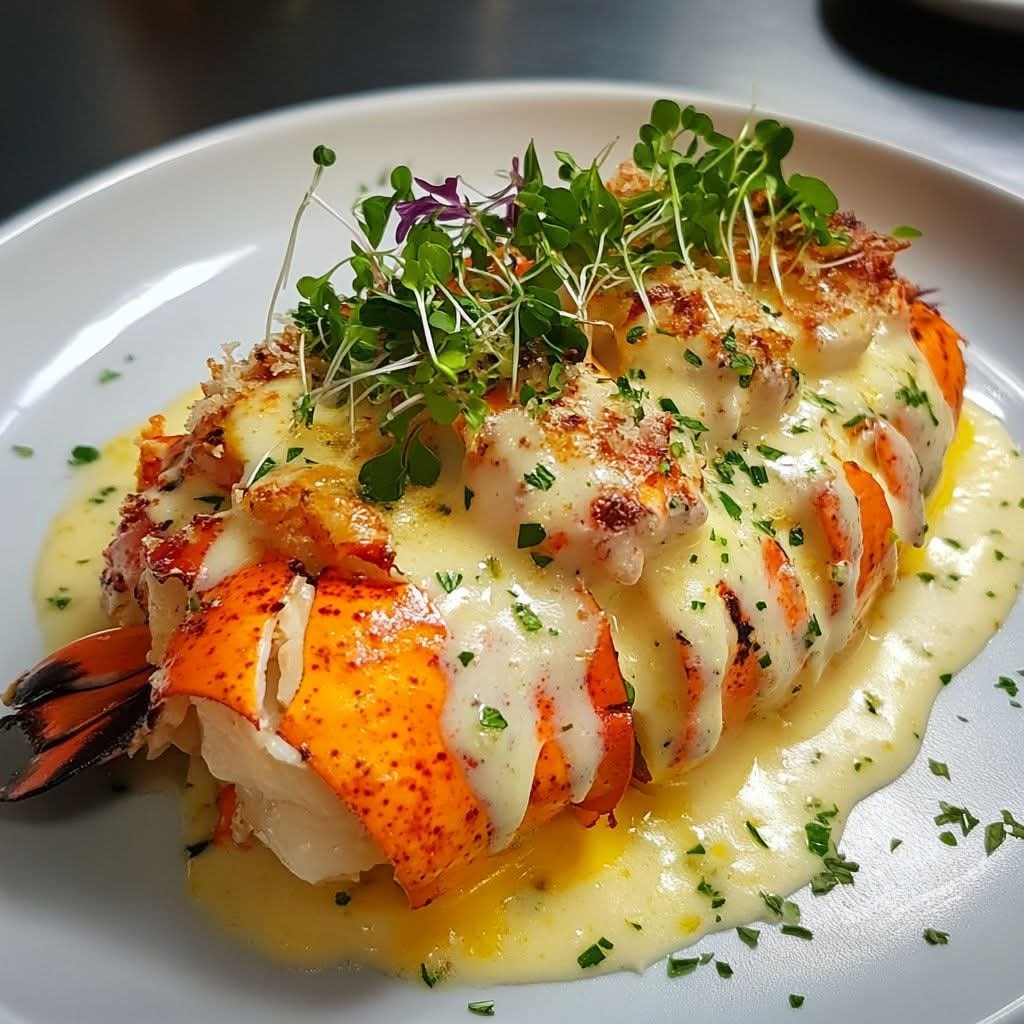 Humr se smetanovou hořčičnou omáčkou, ozdobený nasekanou petrželkou, strouhaným parmazánem a mikrozeleninou: