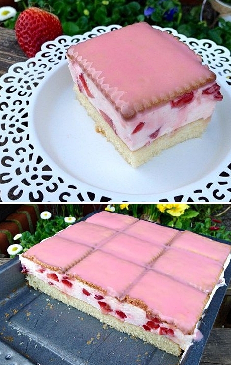 Tento dezert je ztělesněním jemnosti a letní lehkosti. Spojení nadýchaného piškotu, krémového mascarpone, šťavnatých jahod a osvěžující želatiny tvoří dort, který potěší při každé příležitosti – ať už na rodinné oslavě, zahradní párty nebo jen jako sladká odměna během dne. Navrch elegantní sušenka s růžovou polevou a výsledkem je zákusek jako z luxusní cukrárny! 🍰