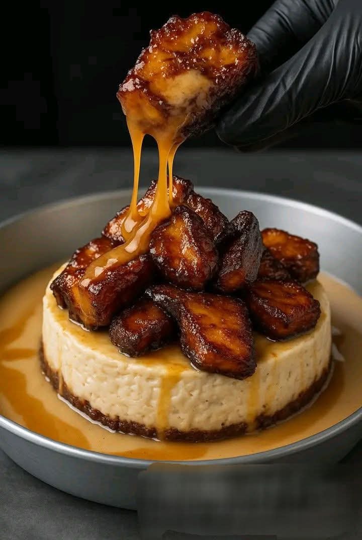 Bohatý, krémový cheesecake s vrstvami zlatavých karamelizovaných banánů a přelitý teplou rumovou glazurou – čistá dezertní blaženost.