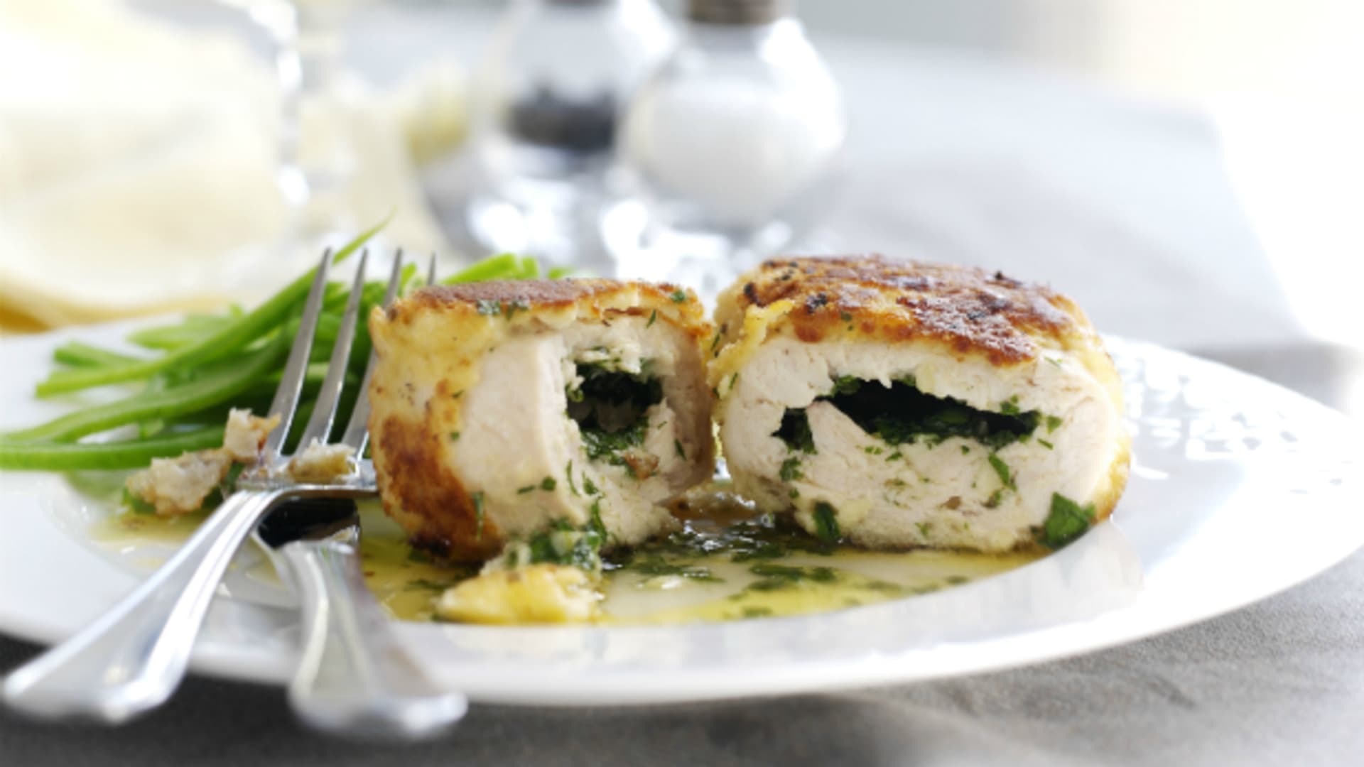 Chicken Kiev aneb jemné kuřecí maso, bylinky, brambory a zelené fazolky… pokud se potřebujete trefit do chutí všem, tohle jídlo vás nemůže zklamat.