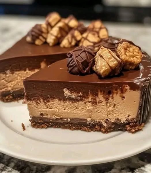 Dekadentní, krémový cheesecake s arašídovým máslem plný Reese’s košíčků, přelitý čokoládovou ganache, karamelovou polevou a šlehačkou.