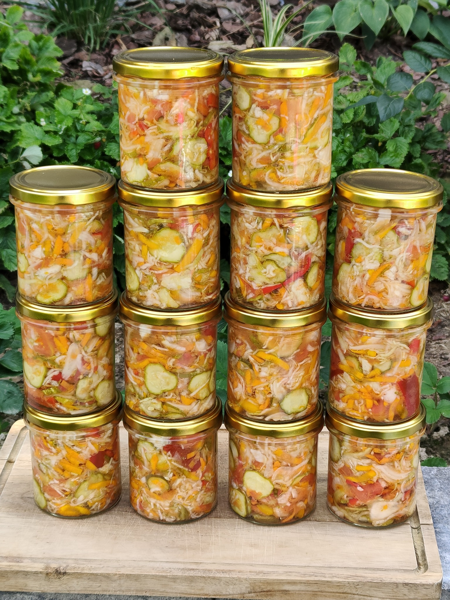 Hmotnost zeleniny se před zpracováním podává, abyste mohli ingredience snadno odměřit. K přesnému měření obvykle používám sklenici o objemu 250 ml. Výsledkem je 15 plechovek o objemu 370 ml s lahodným kubánským salátem připraveným k zimnímu použití. 🥒🥕🧂