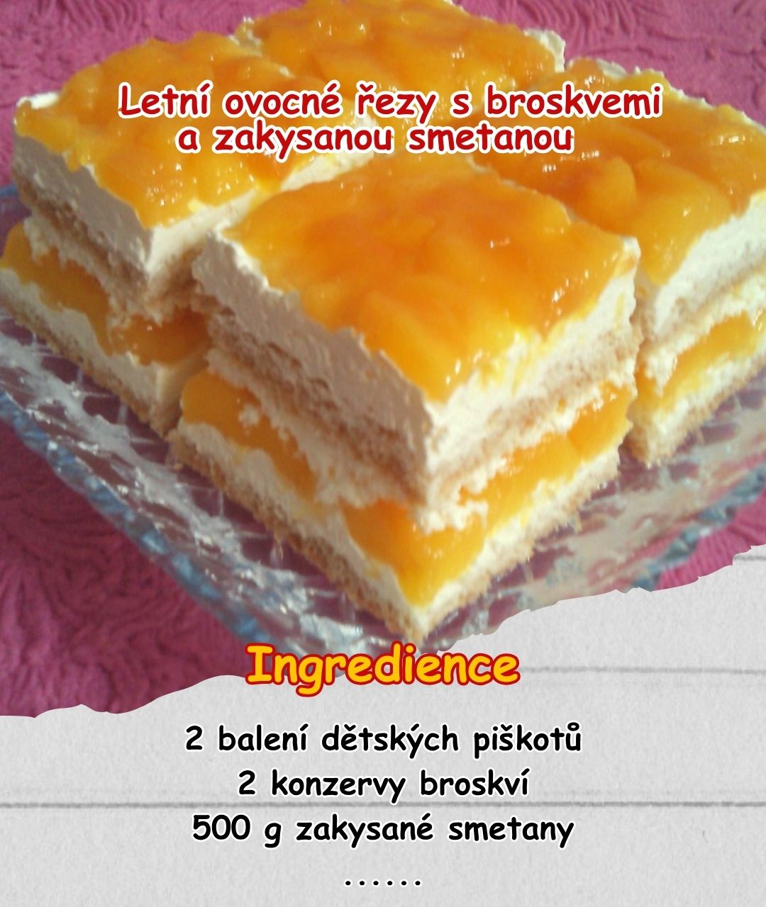 Tyto nepečené ovocné řezy s broskvemi a zakysanou smetanou jsou ideální volbou pro horké letní dny. Jsou svěží, lehké, příjemně sladké a připravené během pár minut bez zapínání trouby. Perfektní dezert k odpolední kávě, na oslavu i jako sladká tečka po obědě.