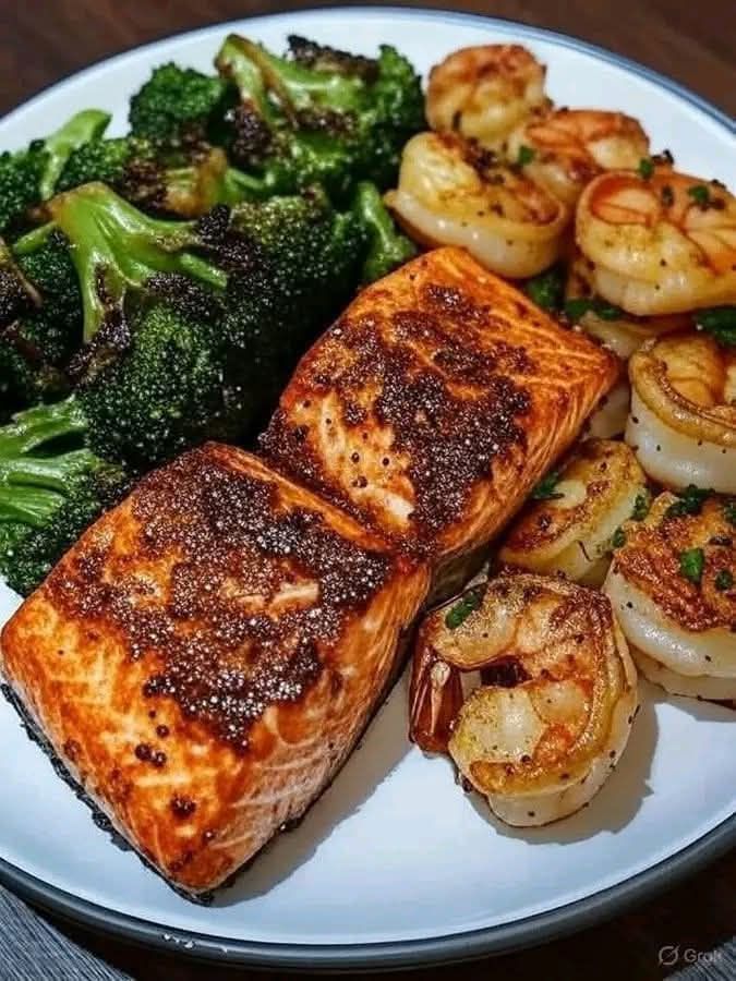 Losos Cajun, krevety v česnekovém másle a pečená brokolice 🥦
