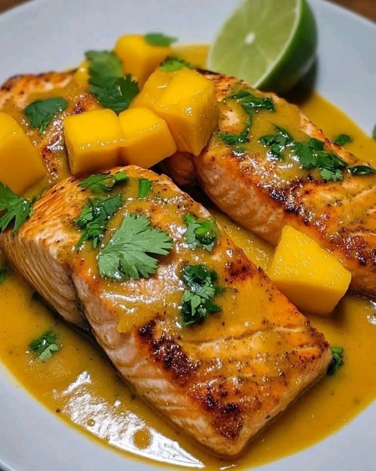 – 🐟 filety z lososa – 4 (asi 600 g) – 🥥 kokosové mléko – 400 ml – 🌶️ kari pasty – 2 lžíce – 🥭 mango – 1, zralé a nakrájené na kostičky – 🍋 limetka – 1, vymačkaná – 🌿 čerstvý koriandr – svazek, nasekaný – 🧄 česnek – 2 stroužky, nasekané – 🧑 🍳 zázvor – 1 malý kousek, nastrouhaný – 🧂 sůl – dle chuti – 🛢️ olivový olej – 1 lžíce (na vaření) Postup: 1. Připravte ingredience: Začněte oloupáním česneku, nastrouháním zázvoru a nakrájením manga na kostičky. Dejte stranou.