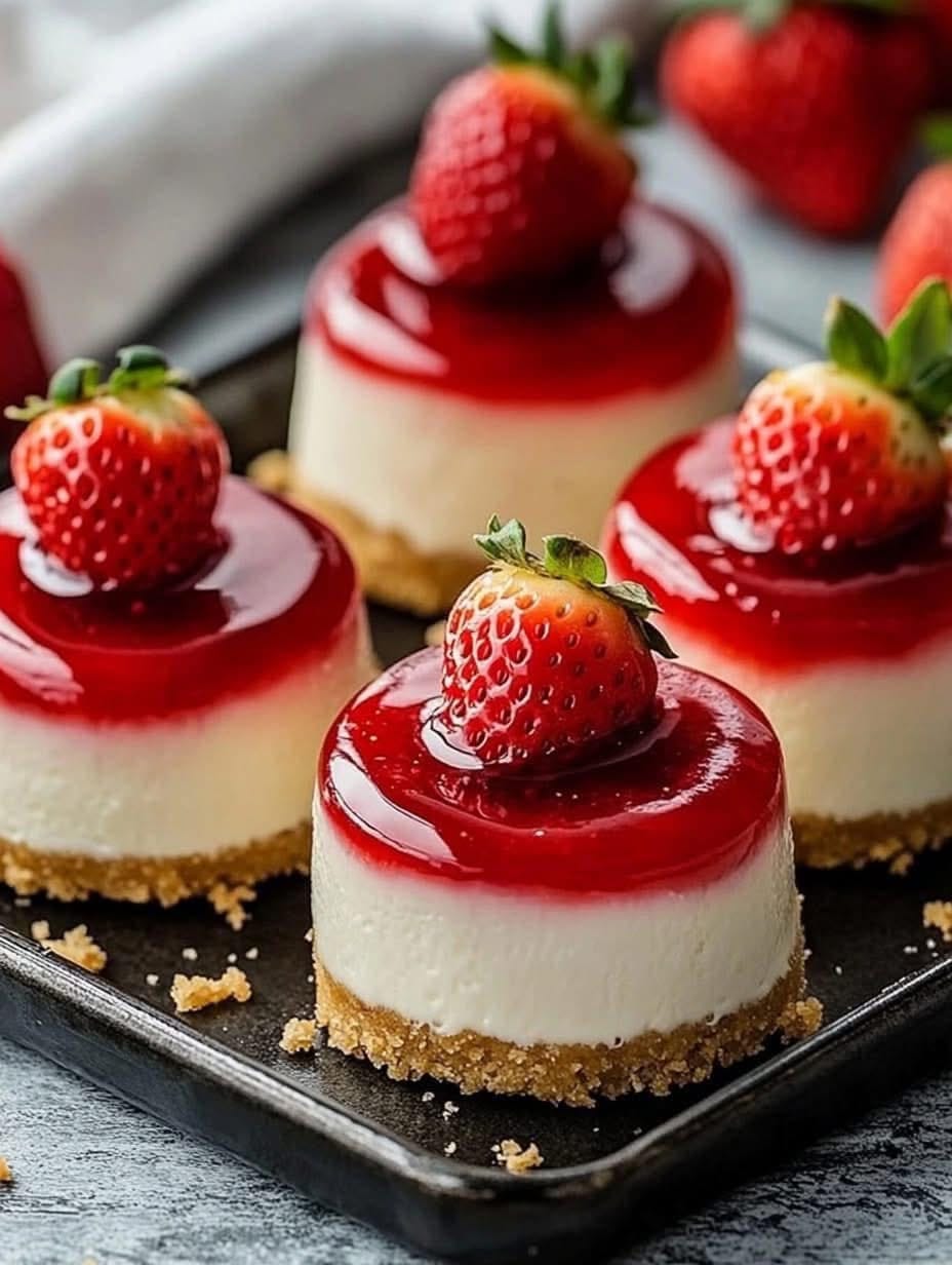 Představte si jemné, krémové cheesecaky, které se rozplývají na jazyku a doplňuje je svěží jahodová omáčka — dokonalá dávka sladké radosti pro každý dezertní stůl.