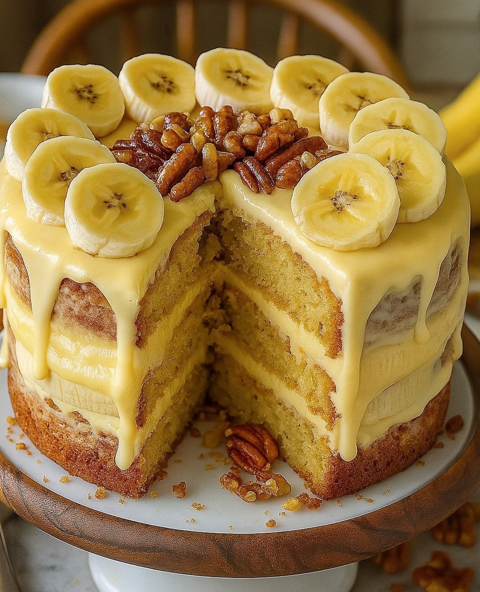 Ultra šťavnatý banánový dortík posypaný opečenými vlašskými ořechy a obalený nadýchanou vanilkovo-sýrovou šlehačkou. Lehký, snový a naprosto neodolatelný!