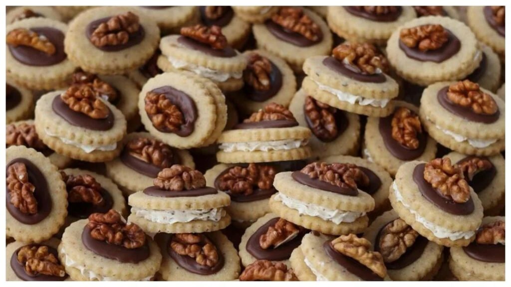 Ingredience: Na těsto: 300 g hladké mouky 100 g moučkového cukru 220 g másla 1 žloutek 100 g mletých vlašských ořechů Na krém: Bílkovo-máslový krém (recept níže) Na dokončení: Čokoláda na polevu Celé vlašské ořechy na ozdobu Postup přípravy: