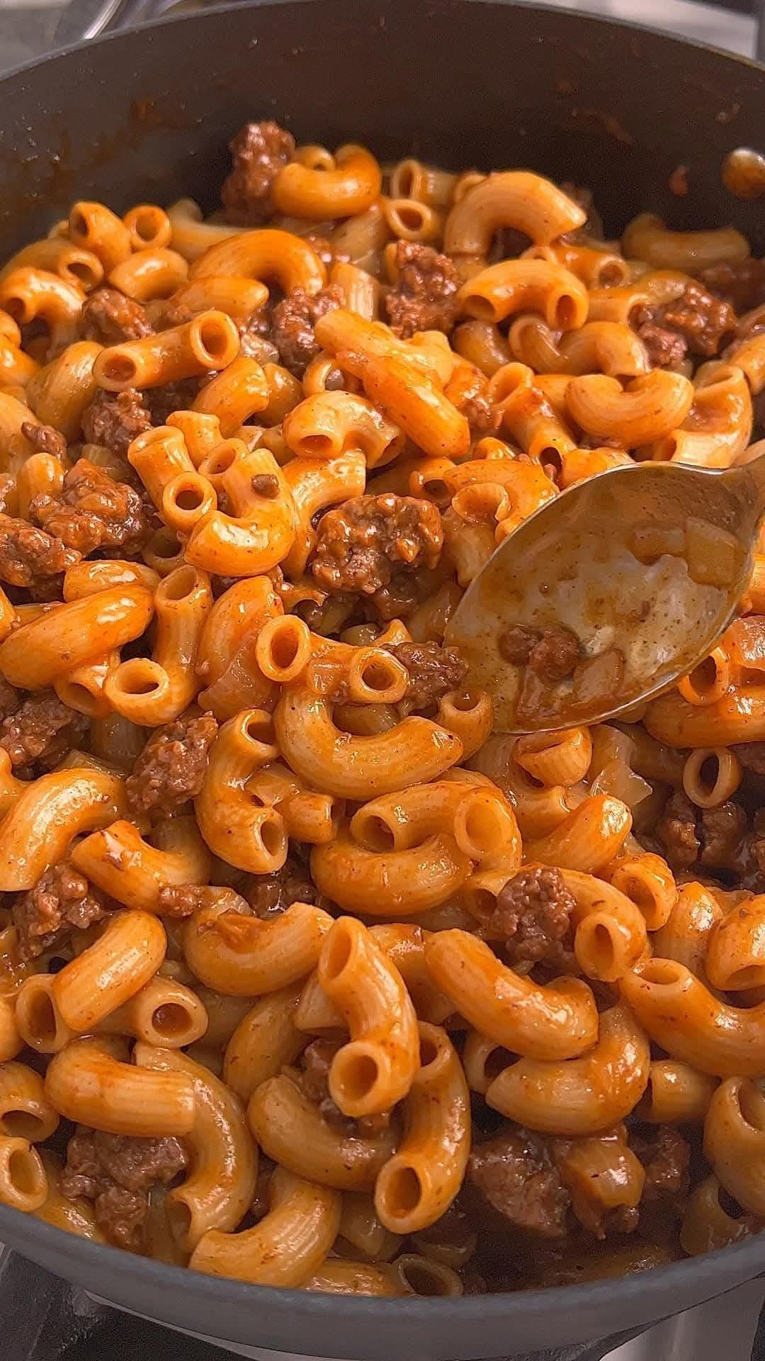 Ingredience: 500 g krátkých těstovin 300 g mletého masa 1 nasekaná cibule 2 šálky rajčatového džusu 2 velké lžíce rajčatového protlaku 2 velké lžíce oleje Sůl a černý pepř 1 čajová lžička papriky 1 čajová lžička česnekového prášku 1 čajová lžička cibulového prášku Postup: