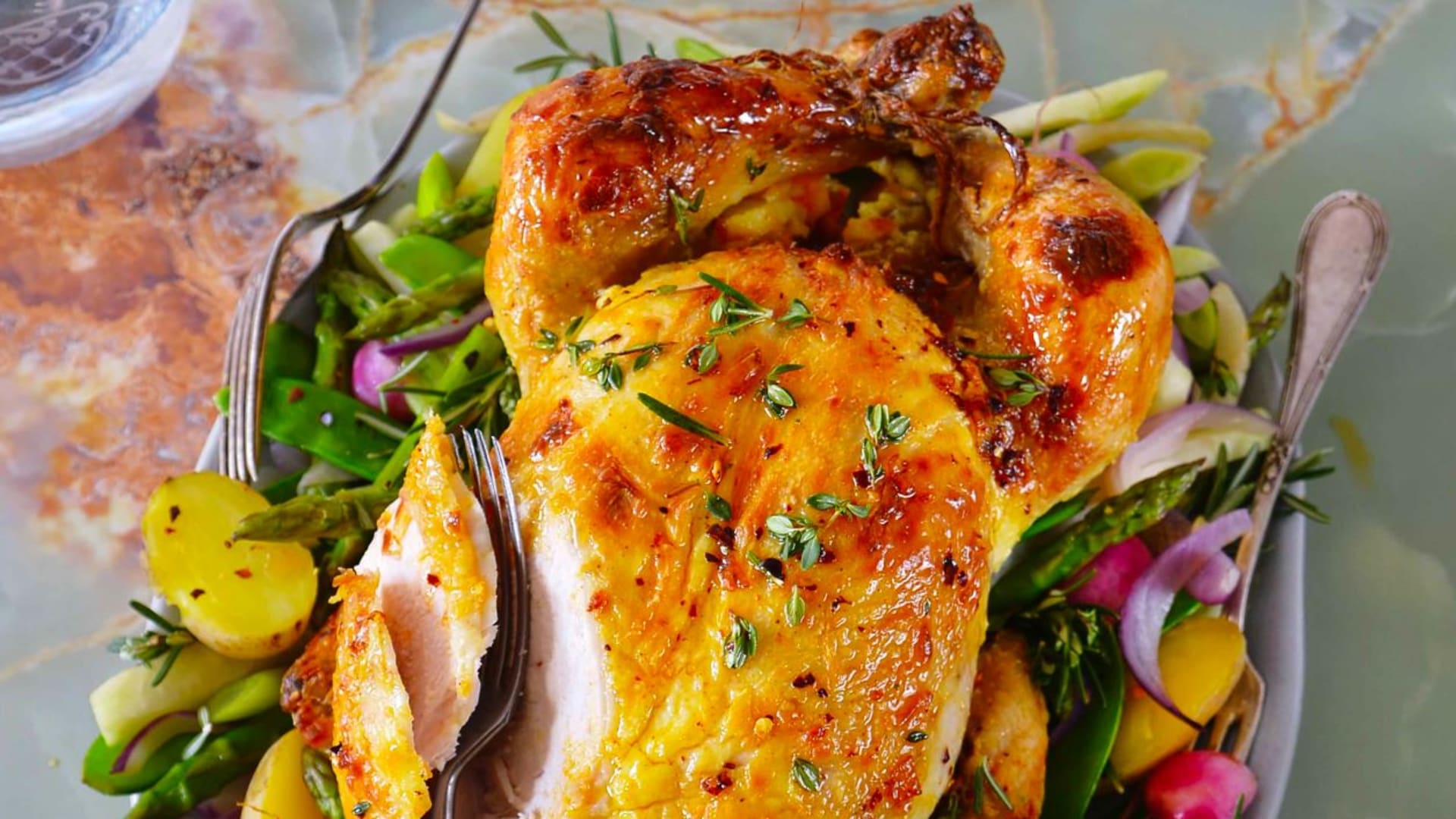 Pečené kuře na smetaně po francouzsku s provensálským frikasé z jarní zeleniny