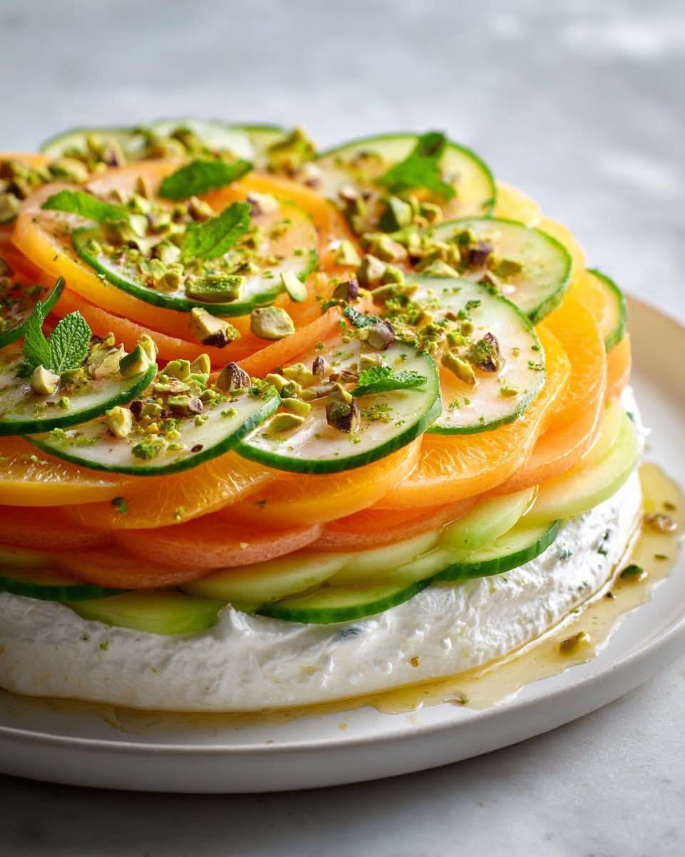 Jemné plátky melounu a okurky se setkávají s krémovou fetou, zářivými citrusy a křupavými pistáciemi.
