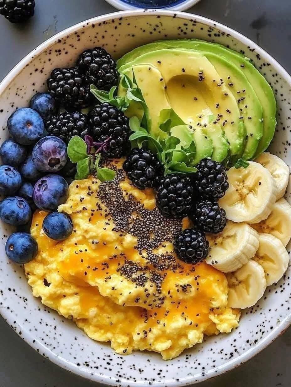 Snídaňová miska s míchanými vejci, avokádem a lesním ovocem 🍇