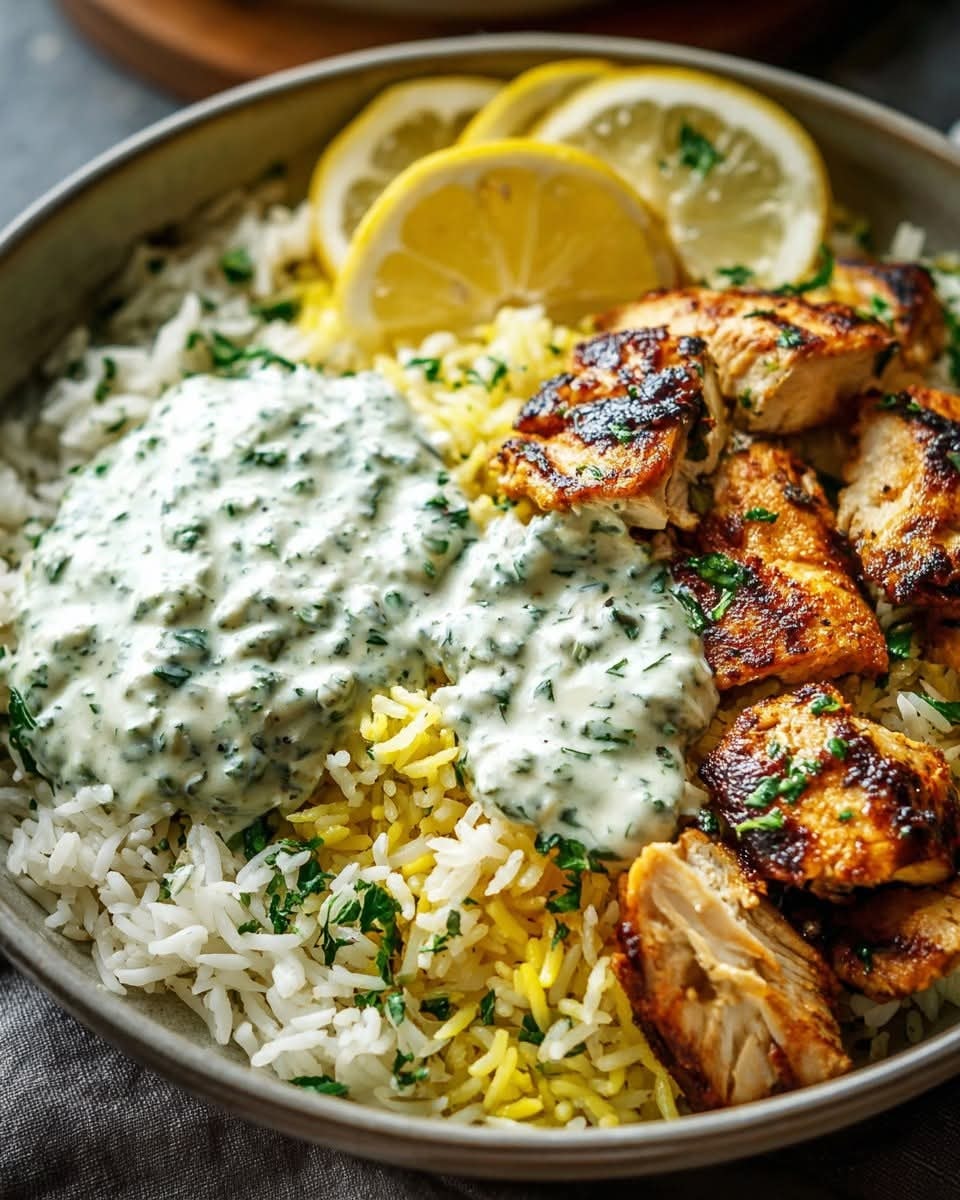 Ultimátní kuřecí miska s citronem a bylinkami, krémovou česnekovou omáčkou a nadýchanou rýží