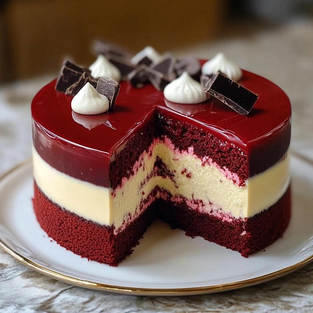 Dekadentní dezertní mistrovské dílo, které v sobě spojuje vláčný cheesecake Red Velvet, krémový cheesecake a výraznou lesklou glazuru.